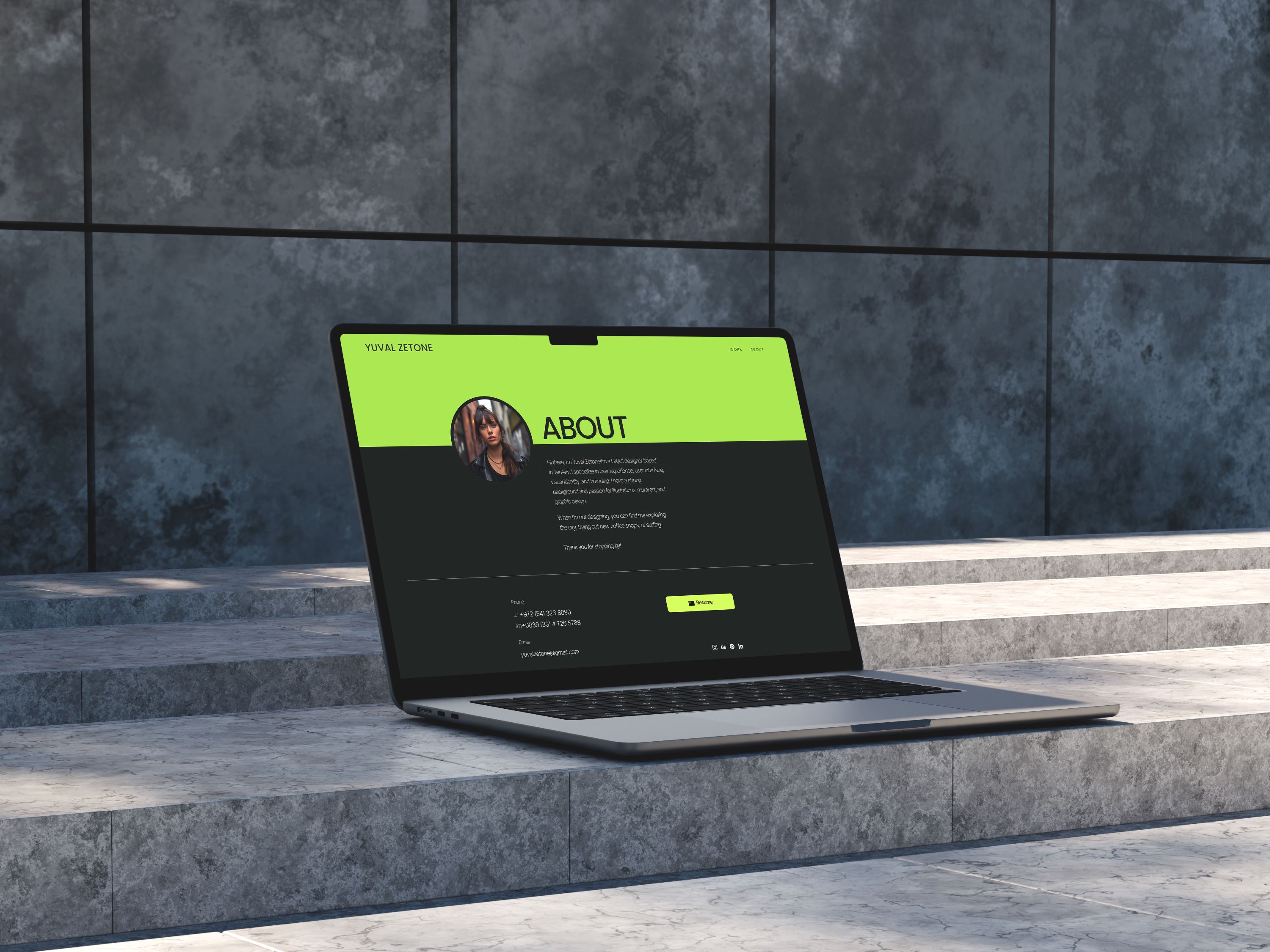Yuval Zetoune, a UX designer from Tel Aviv, needed a website to showcase her work creatively with an interactive hero section, animations, and an integrated about page featuring her CV and social media links.